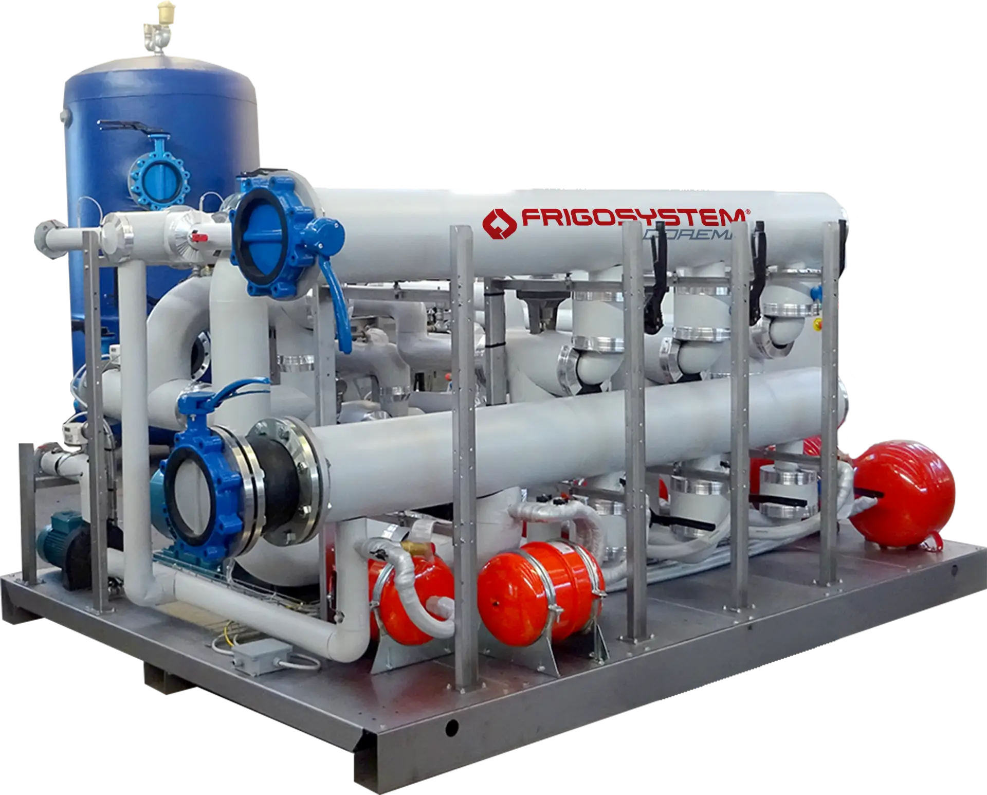 Frigosystem Corema’s SKID pumping units are complex hydraulic intermediation systems designed to manage fluid circulation between chilled water production plants and utilities. Each SKID is engineered with precision to meet specific flow rates, temperatures, and pressure requirements of the installation site. With high flexibility and customization, SKID units provide the perfect integration for industrial cooling and heating processes, ensuring efficiency, reliability, and long-term durability.